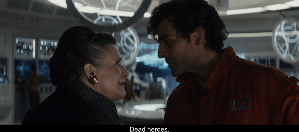 When Poe returns, focused solely on the fact that they did in fact destroy a Dreadnaught, Leia patiently tries to show him the error of his ways. She slaps our stereotypical hero and DEMOTES HIM. She needs him to learn that some problems can’t be solved by jumping into an X-Wing and blowing things up. But “Those were heroes,” Poe says. “Dead heroes,” Leia replies. “No leaders.”