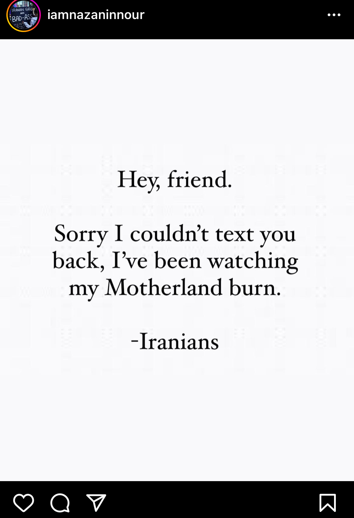 Iran is burning — while I comfortably sit here. Watching from afar. Watching a country that I’ve never outwardly cared for. A culture I resented for much of my life. A language I’ve barely held onto. Values I vaguely know. Connections I’ve made little to no attempts to maintain. It fills me with worry. With fear. With guilt. With an acute sensitivity to how – in some ways – the fact that I didn’t grow up in Iran is completely accidental. My parents happened to get out. Partly because they happened to be Bahá’ís. And they happened to move to different parts of the world where I experienced my upbringing. At any point, the slightest change could have resulted in a completely different life. I’d still be in Iran today. Maybe I’d be imprisoned/beaten for being a Bahá’í. I certainly wouldn’t have been given access to an education. Maybe I wouldn’t have been a Bahá’í at all. Either way, I see the amazing number of people of all ages out in droves standing in solidarity with each other, and I can’t help but wonder how many of them would have been my friends? My classmates? My colleagues? My cousins? How many of them would I have seen beaten, tortured, thrown in jail, murdered, raped, and executed? Just for standing for justice, love, and freedom? I see them. I see them. I see them.