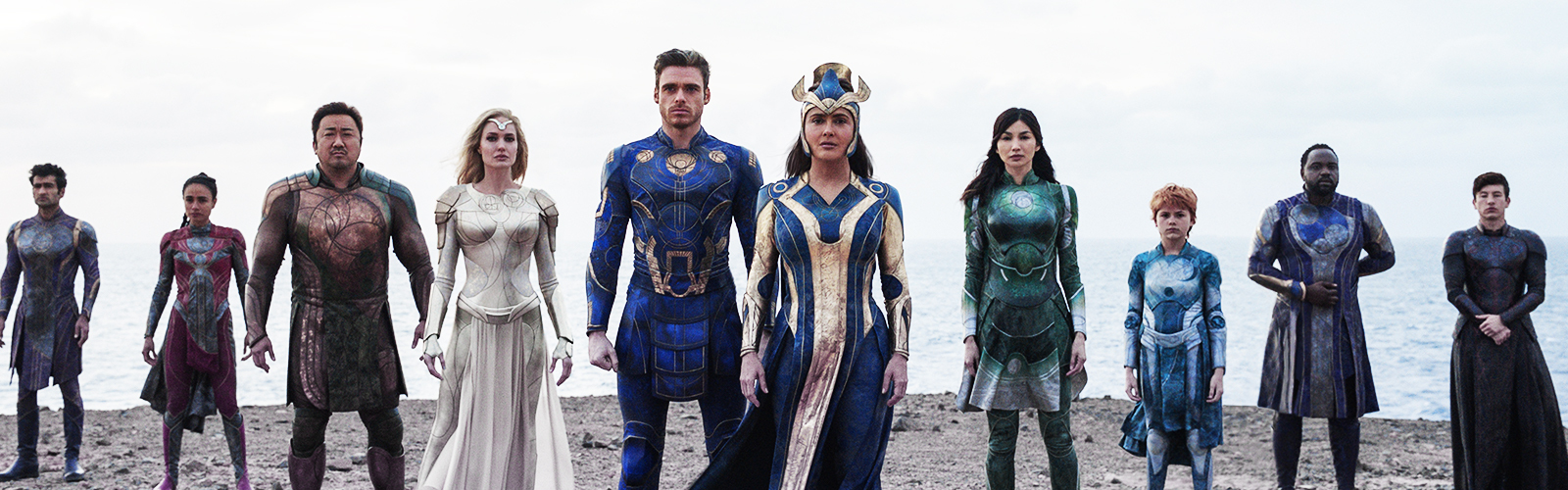 In Marvel’s Eternals, directed by Chloe Zhao, we are introduced to a group of 10 Eternals – immortal beings created by the Celestial Arishem – who are sent to Earth to protect the planet from Deviants, gnarly creatures who hunt and kill people. Or so that’s what they’ve been told. Over the course of the movie, we follow the team across 7,000 years as they fight Deviants – and at times each other – and struggle with interpersonal conflicts as well as the nature of their purported mission. They have incredible powers, live among humans, but are not allowed to interfere in any human conflicts — unless it involves Deviants. Once they think they’ve killed all the Deviants, their leader Ajak sees the toll their mission has taken and orders them all to split up and live their lives on Earth until they are called back home to the planet Olympia.